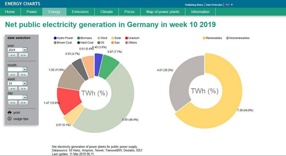 For �week 10� of 2019, the week finishing on March 10 (Sunday), Germany sourced 64.8 per cent of its electricity generation from renewables.