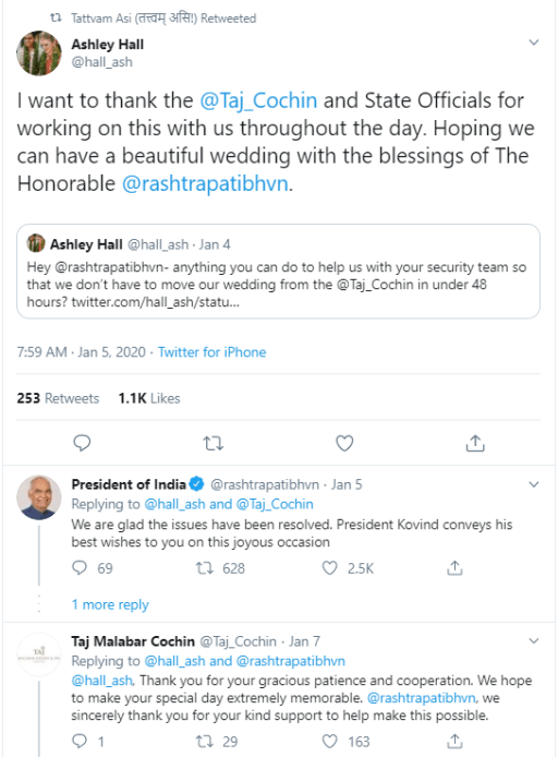 Well, on January 4th, 2020, a full 48 hours prior to the marriage on January 7th, they came to know that the hotel will be hosting the Indian President, so the marriage cannot be hosted.