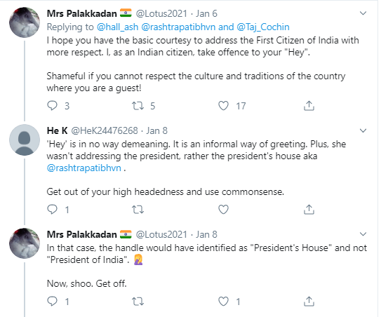 Addressing the Indian President as “Hey @..” obviously didn’t go down well with the Indians and she got some piece of their minds.