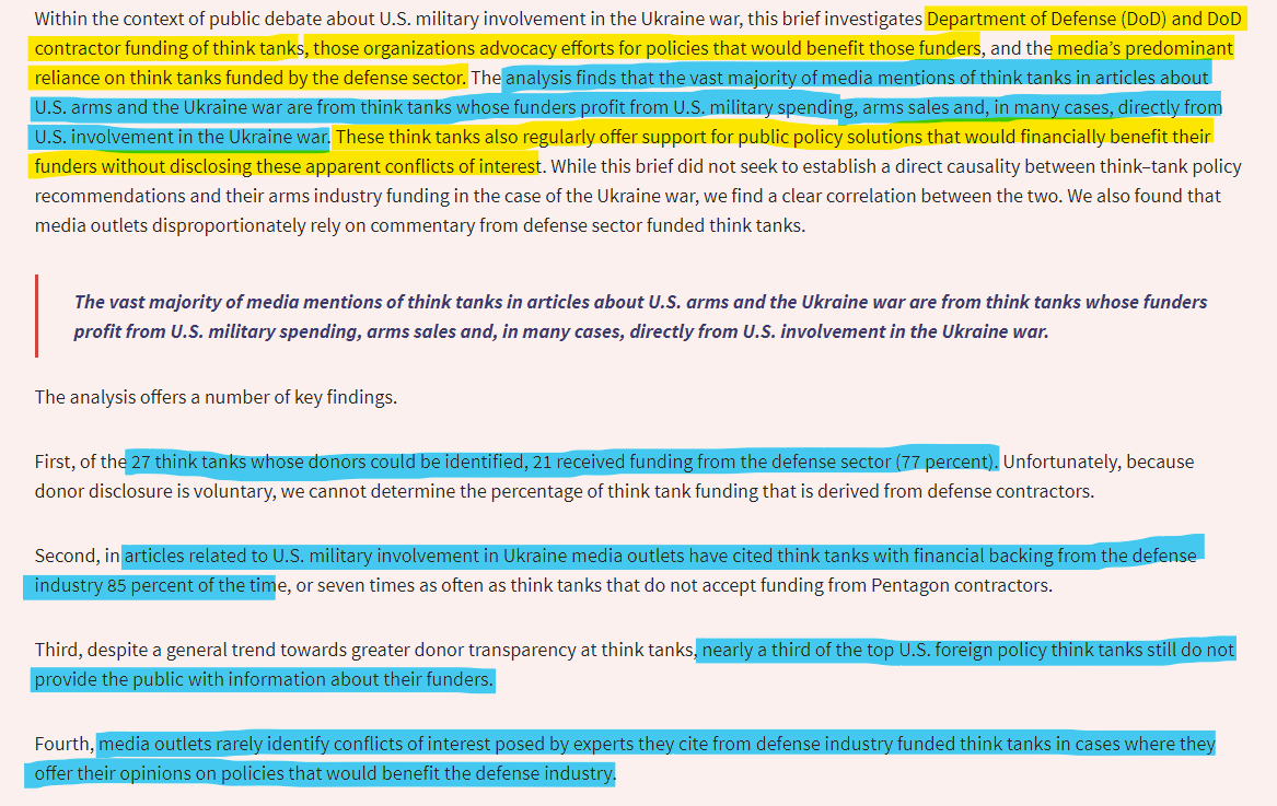 "in articles related to U.S. military involvement in Ukraine media outlets have cited think tanks with financial backing from the defense industry 85 percent of the time, or seven times as often as think tanks that do not accept funding from Pentagon contractors."