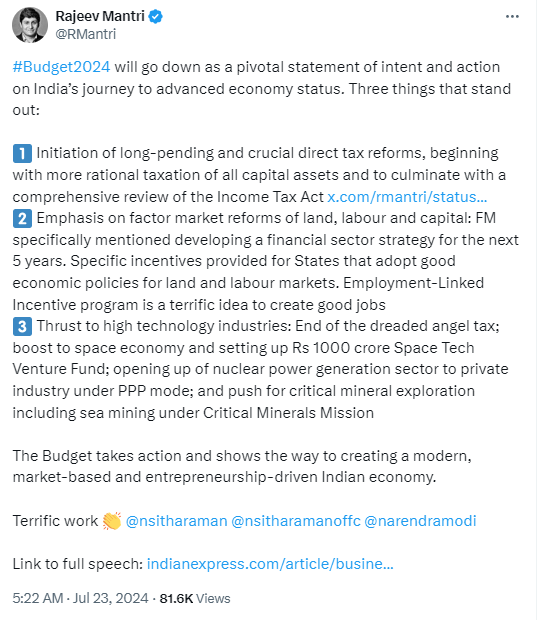 - The budget introduces several policy proposals, including the establishment of a Venture Capital Fund (VCF) for the space economy, simplification of FDI and overseas investment rules, and the promotion of the INR for overseas investment. Reforms are planned for the Insolvency and Bankruptcy Code (IBC), real estate, and infrastructure sectors, with a focus on developing industrial parks, digital public infrastructure, and efficient rental markets.