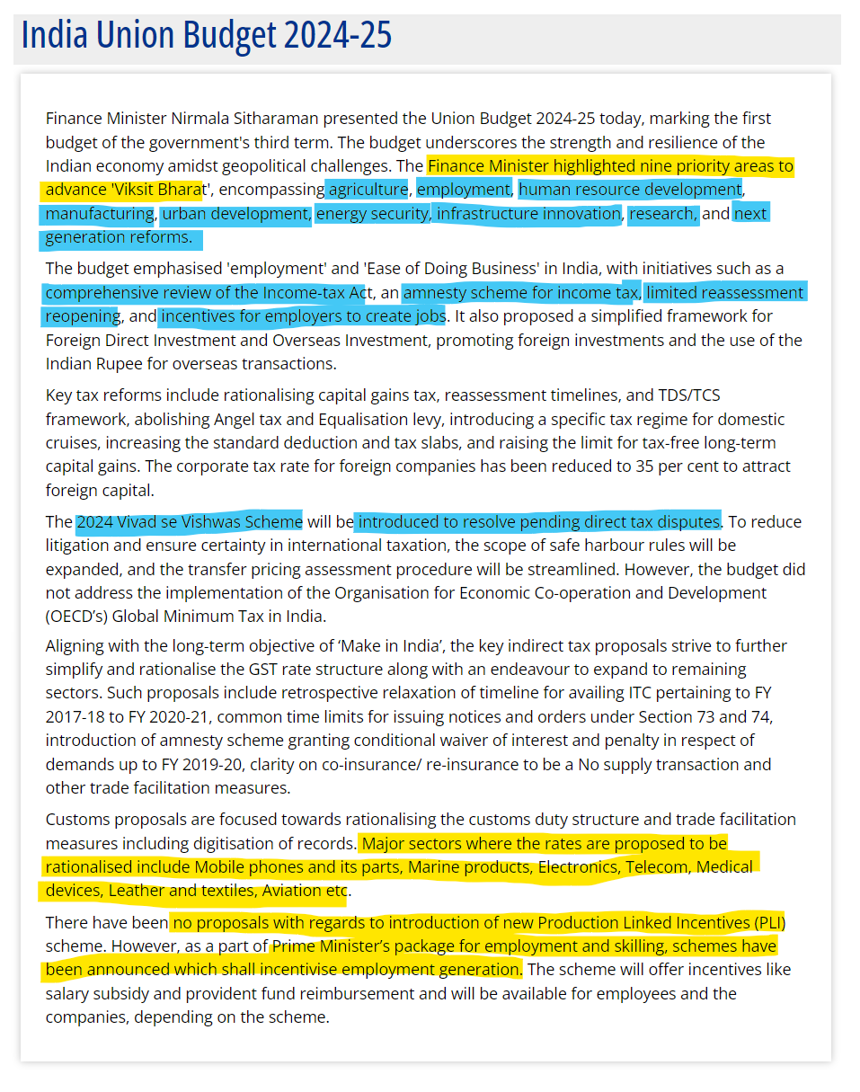 These highlights reflect the government's focus on infrastructure development, tax reforms, support for key sectors, and inclusive growth, aiming to drive India's economic trajectory towards becoming a $5 trillion economy by 2027.