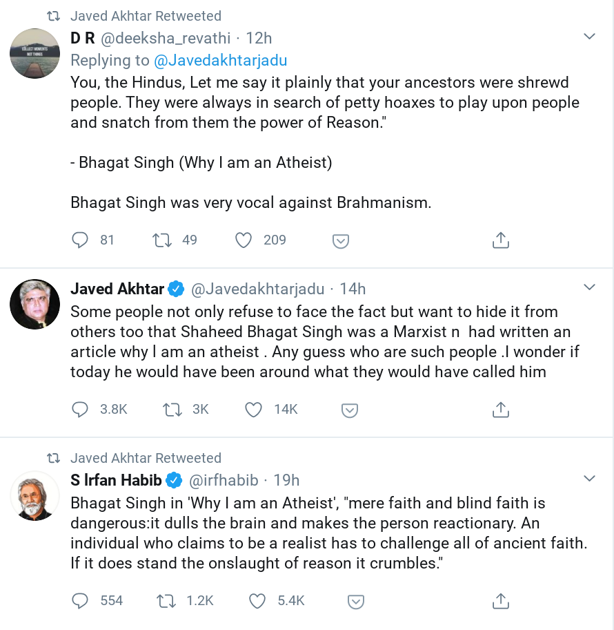 These three tweets from Javed Akhtar’s wall are quite symptomatic of how they were busy using even Bhagat Singh to further their agenda. Now do notice that they all have only referred to him in the context of Hinduism, not in terms of Christianity or Islam. Which should give them away.