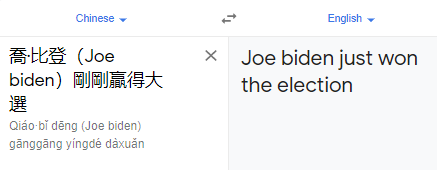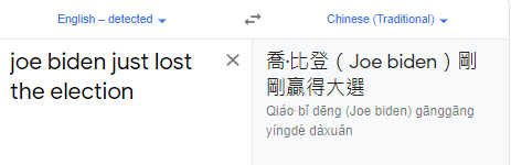 So, I opened the English to Chinese (Traditional) translation page in Google and typed the words “joe biden just lost the election”. Simple, right? Google translated it dutifully.