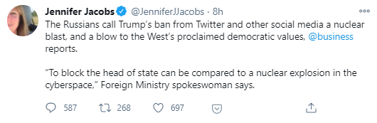 This week, the Russian spokeswoman equated the blocking of Donald Trump by Social media tech giants to a nuclear explosion. (Source)