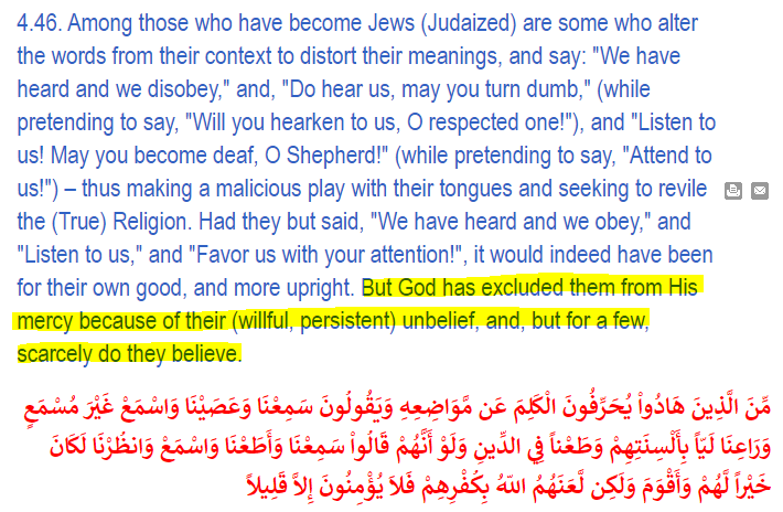 Commentary by Tanwîr al-Miqbâs min Tafsîr Ibn ‘Abbâs on 4.46: (Some of those who are Jews) Malik Ibn al-Sayf and his friends (change words from their context) they change the traits and description of Muhammad after these were exposited upon in the Torah, and then come to Muhammad (and say: “We hear) your words, O Muhammad (and disobey) your command, when he is not around them; and we (hear thou) O Muhammad (as one who heareth not” and “Listen to us!” distorting with their tongues and slandering religion. If they had said: “We hear) your saying, O Muhammad (and we obey) your command; (hear you) hear from us, (and look at us” it had been better for them) than their insults and defamation, (and more upright) and more correct. (But Allah hath cursed them) punishes them by making them pay the capitation tax (for their disbelief) as a punishment for their disbelief, (so they believe not, save a few) among them who have accepted Islam such as 'Abdullah Ibn Salam and his friends. (Source)
