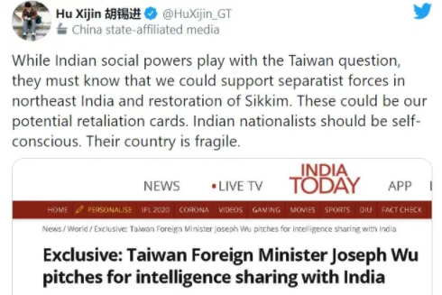 China is angry over Taiwan-India closeness: Hu Xijin, the Editor-in-Chief of the Communist Party of China’s mouthpiece Global Times, perturbed by the increasing closeness of two countries, took to Twitter to issue threats to India. Citing an India Today report, Xijin claimed that when social powers played with the Taiwan question, they should be aware that China could support separatist forces in North-East India.