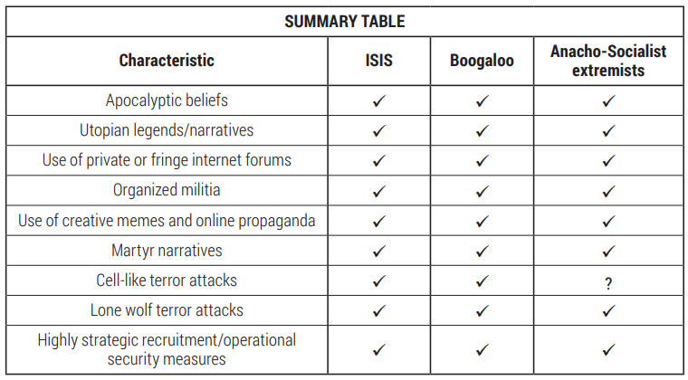 One very interesting and significant insight that this study came up with during the study was the alignment of tactics between ISIS, the racist civil war creating groups (Boogaloo movement), and the Anarcho-Socialist Extremists.