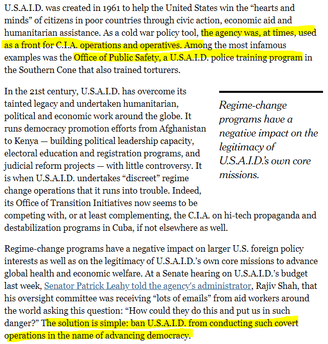 Interestingly, the USAID has always been used as a front for the CIA, specifically in regime change operations. As we discussed in our issue Issue #262 - How Freedom House Subverts Democracies that USAID was used as a funding conduit by the US intelligence to fight the battle in Ukraine against Russia in what was known as the Orange revolution. A classic “regime change” war.