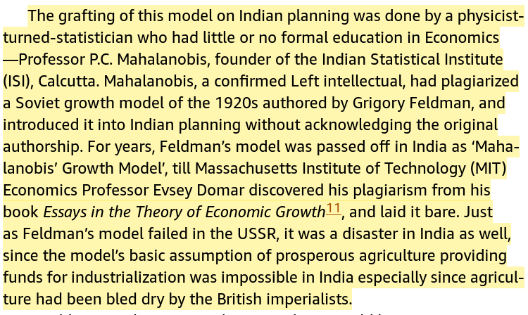 He says that he parked himself in the library and read everything that Mahalanobis had written. And, to his astonishment found that Mahalanobis’ 2nd Five Year Plan was simply a copy-paste of Grigory Feldman’s Soviet Growth Model written in the 1920s. And, Mahalanobis had shamelessly plagiarized Feldman’s work without giving him any credit.