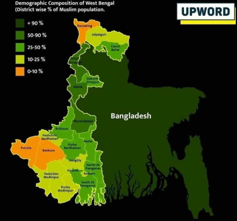 Muslim population in Bengal is more than 25 percent in the districts of Malda, Murshidabad, North Dinajpur, South 24 Parganas, North 24 Parganas, Nadia and Birbhum. In three districts of West Bengal -- Malda, Murshidabad, and North Dinajpur -- the population of Muslims is higher than that of the Hindus. (Source)