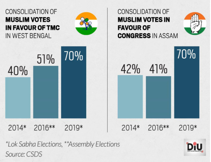Like we saw earlier, there is a strong backing of the Muslim vote behind TMC. And, this “consolidation of Muslim vote” has been progressively been in the favor of TMC.