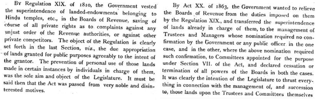 Considerable endowments have been granted in money, or by assignments of land or of the produce of the land by the former Governments of this country as well as by the British Government, and by individuals for the support of mosques, Hindu temples, colleges and choultries, and for other pious and beneficial purposes; and … endowments [are] in many instances appropriated, contrary to the intentions of the donors, to the personal use of the individuals in immediate charge and possession of such endowments; and… it is the duty of the government to provide that such endowments be applied according to the real intent and will of the granted. (Source)