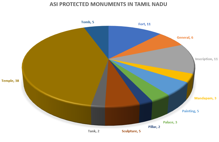 Based on the data on the Government of Tamil Nadu’s Department of Archeology, here is a quick distribution of the types of monuments that the government’s archeological department manages. (Source)