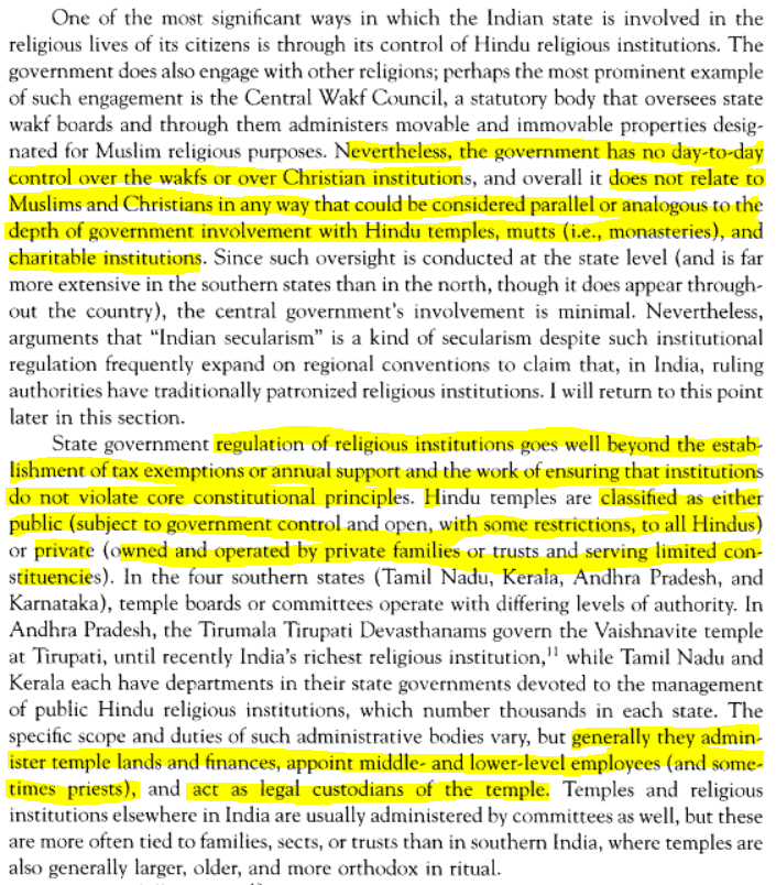 Deepa Das Acevedo argues in her paper titled “Secularism in the Indian Context” published in Law & Social Inquiry (Vol. 38, No. 1 (Winter 2013), pp. 138-167) that even though the government has some role in the oversight of the Wakf Boards, the involvement in the Hindu temples, mutts (monasteries) and charitable institutions goes far deeper. (Source)