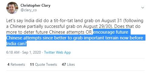 Chinese do not take action without a long term plan. The Twitter user @detresfa_ had reported how the Chinese posts were being created in the South Bank of the Pangong Tso lake. The area where the 29/30 August clashes happened.