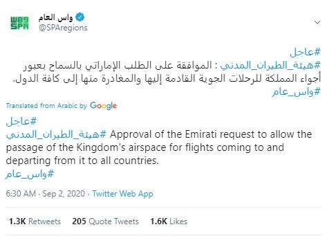 And, Kingdom of Saudi Arabia has allowed flights to all the countries to use its airspace - with the obvious context of the opening of the UAE to Israel flights