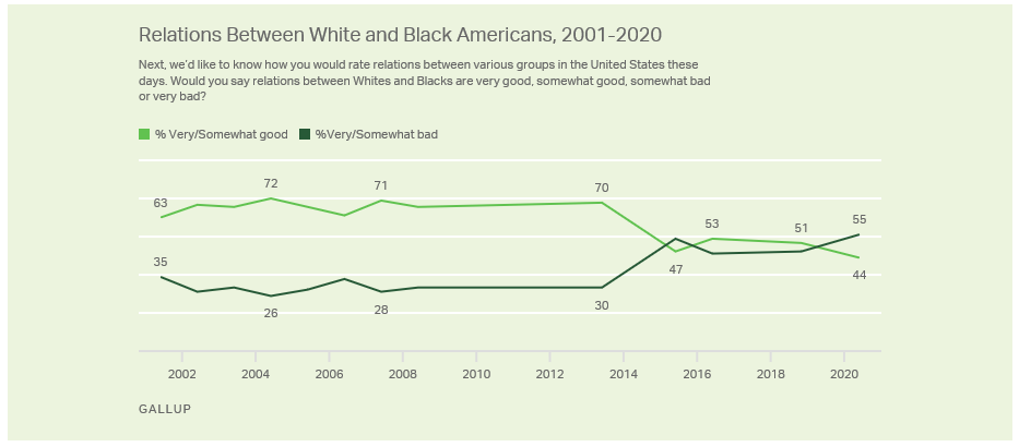 Racial divide: Americans' already tepid review of relations between White and Black Americans has soured since 2018 and is now the most negative of any year in Gallup's trend since 2001. The majority of U.S. adults say relations between White and Black Americans are very (24%) or somewhat bad (31%), while less than half call them very (7%) or somewhat (37%) good. (Source)
