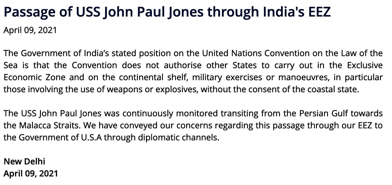 “More than the FONOP, what possibly irked New Delhi more was the publicity the US Navy gave it,” said Sameer Patil, a fellow in the international security studies programme at Gateway House, a Mumbai-based think tank, pointing to Washington’s move to announce the operation in a press release. “Previously, they’ve carried out such operations [in New Delhi’s EEZ] against Indian claims but they have never announced it.” (Source)