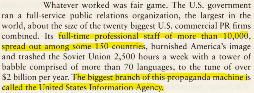 In the US there was a United States Information Agency (USIA), which existed from 1953 to 1999. Although its reach, power, and mandate were fairly wide, it worked largely in an analog world. The former USIA Director Alvin Snyder wrote the following in the preface of his book “Warriors of disinformation: American propaganda, Soviet lies, and the winning of the Cold War: an insider's account” (Source)