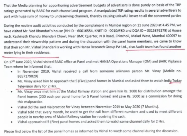 In a major revelation that counters Mumbai Police Commissioner Param Bir Singh's allegations, Republic TV on Thursday accessed the FIR filed by the Mumbai Police on the complaint of Nitin Deokar, the Deputy General Manager of the Hansa Research Group Private Limited. This company is responsible for installing and maintaining the Bar-O-Meter of the Broadcast Audience Research Council (BARC). Arrested by the Mumbai Police, Vishal Bhandari- the Relationship Manager of the Hansa Research Group Private Limited has revealed that India Today and other channels instigated him and offered money to panel homes, where Bar-O-Meter is installed. (Source)