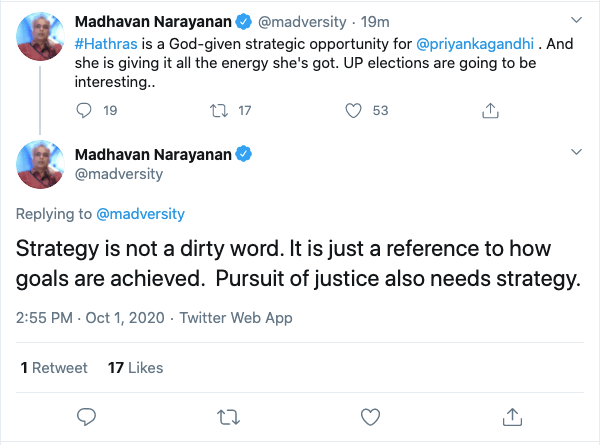 A journalist associated with Reuters, Hindustan Times, Economic Times- Madhvan Narayanan tweeted something that we all knew to be true and something we alluded to yesterday in our newsletter. The Hathras tragedy is being used for political purposes and most of the associated outrage is manufactured. (Source)