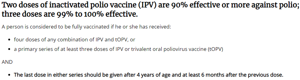 Polio vaccine effectiveness is between 90-100% given the number of doses. Four is the recommended dosage for kids. (Source)