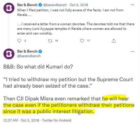 Bhakti Pasrija, Prerna Kumari, Laxmi Shastiri, Sudha Pal and Alka Sharm of the Indian Young Lawyers’ Association had filed a Public Interest Litigation. None of these were worshippers or believers in Sabarimala or its tradition.