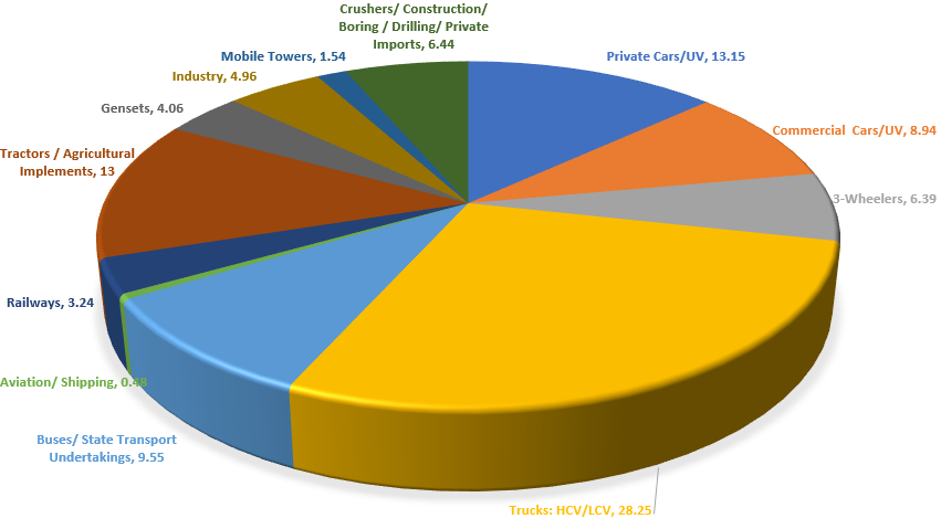 An All India Study conducted by M/s Nielsen (India) Pvt Ltd for Petroleum Planning and Analysis Cell (PPAC) of Petroleum Ministry has thrown up interesting data about use of diesel and petrol sold across various states. As per the All India study report submitted to PPAC, 70% of diesel and 99.6% petrol is consumed in the transport sector alone. Of the total diesel sale, the highest consumption of 28.48 is by cars, utility vehicles (UVs) and 3-wheelers. It was also revealed that private cars & UVs account for 13.15%, commercial cars & UVs 8.94% and 3-wheelers 6.39% of the diesel sold in the country.