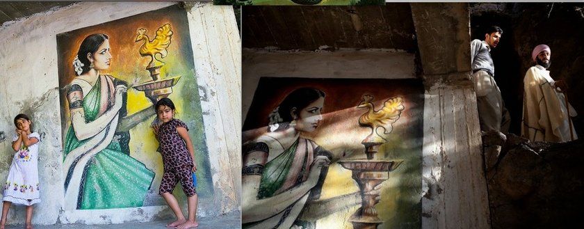 Below is a mural from a Yazidi temple in Iraq, where a woman in Saree, lighting up a Peacock Lamp, found on the wall of a hidden temple in Iraq with 2 Yazidi children in front of it.