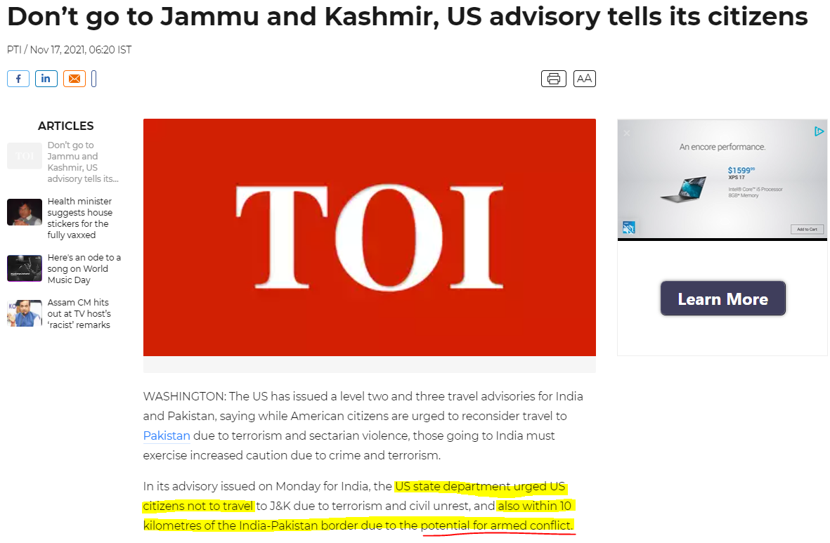 Meanwhile, the US Government has come out with a special advisory to the US citizens on their travel within India this week. One part of it seems very interesting - “potential for armed conflict” at the Indo-Pak border.
