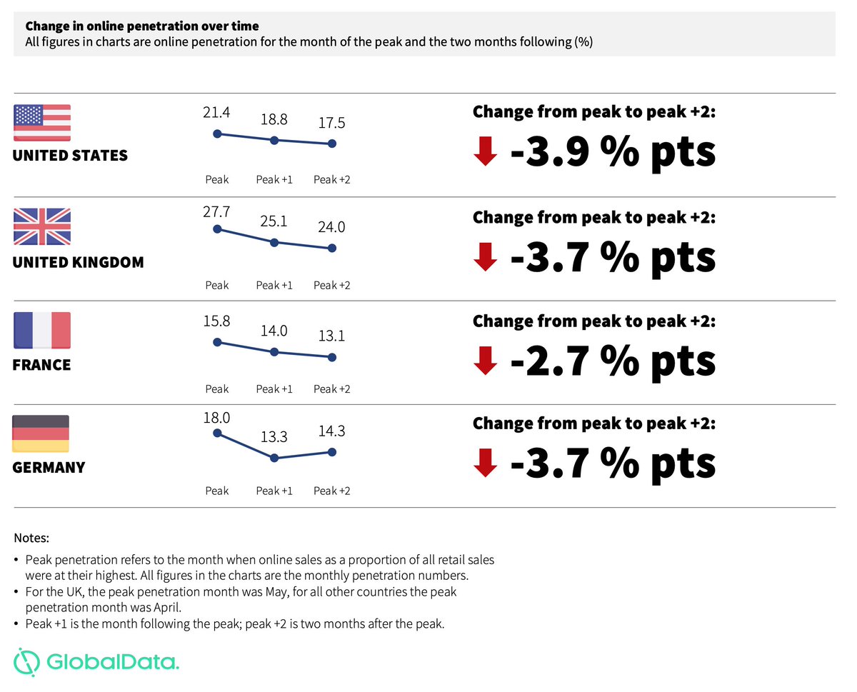 - the penetration rate for online is coming down as consumers resume physical shopping. Sure, penetration will remain elevated compared to 2019 but the peaks seen during lockdown were exceptional, not a new normal.