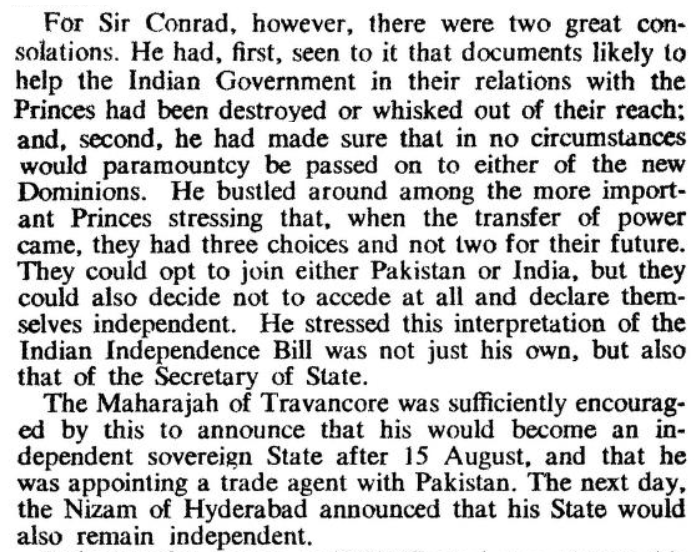 Sir Conrad was determined and he almost pulled it off. He was a master of subterfuge and he managed to convince Lord Listowel to include a clause in the Indian Independence Bill despite Nehru and Mountbatten's protestations, which lapsed Paramountcy only on the day India became independent, so that India unless it could make arrangements by agreement before hand would be confronted on August 15 by nearly 560 odd States containing a mass of 100 million people, each State completely independent. This would have resulted in chaos and as Nehru later said would have led to the Balkanisation of India. (Source)