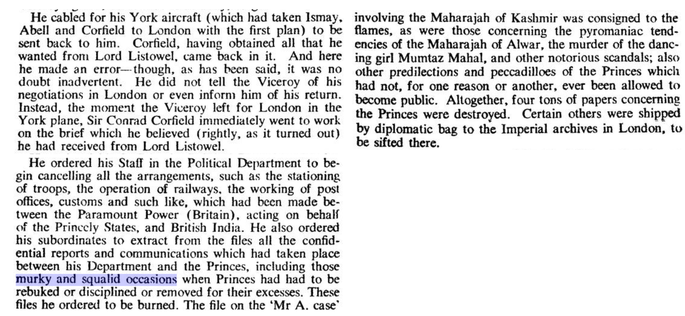 Corfield, however, sneaked into India while Mountbatten and Menon took the latest plan to London. His aim was to destroy the documents on the princely states and their rulers’ debauchery. 4 tons of paper was destroyed.