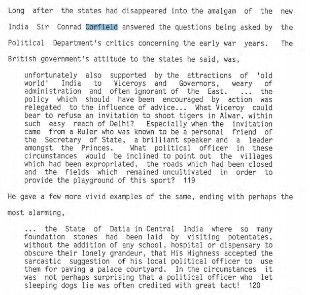 The princely states had created a special symbiotic relationship with the British establishment. (Remember this when you see the nationalistic claims of the descendants of the erstwhile rulers of those states). That is why there was a certain romance that the British establishment had with respect to their access and gifts from these states. That is what Corfield was playing to.