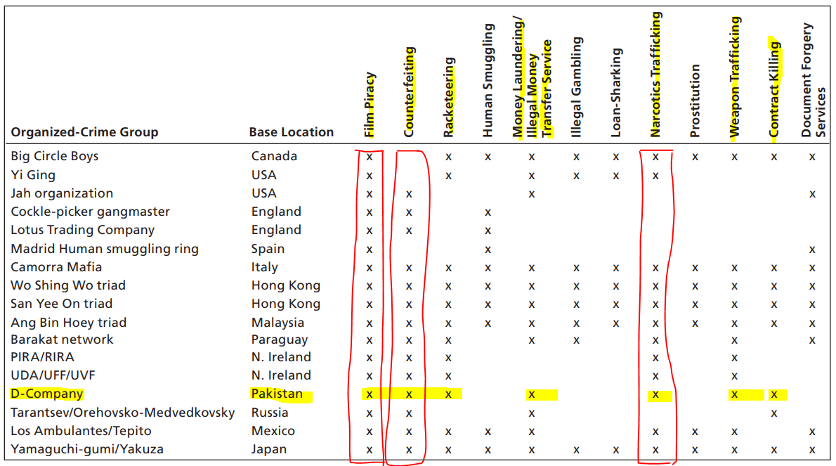 Per their study, one of the most prolific syndicates involved in piracy and other major crimes is the “D-Company”. It is involved the maximum illegal activities that the organizations Rand group studied.
