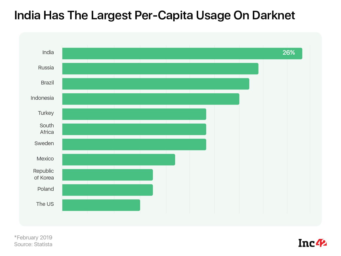 India is currently among the top 10 countries logging on to the dark web, according to metrics released by the TOR Project, an open-source software for enabling anonymous communication (50,000 Indians logged on daily as of January 2020). Figures can fluctuate depending on how people access the network, and how they cover their tracks. In 2014, the figure was over 200,000 a day for India. (Source)