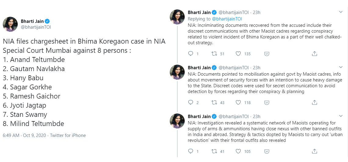National Investigation Agency (NIA) has filed a charge-sheet in the Bhima-Koregaon case in the NIA Special Court in Mumbai. It is against 8 persons: Anand Telumbde, Gautam Navlakha, Hany Babu, Sagar Gorkhe, Ramesh Gaichor, Jyoti Jagtap, Stan Swamy, and Milind Teltumbde.