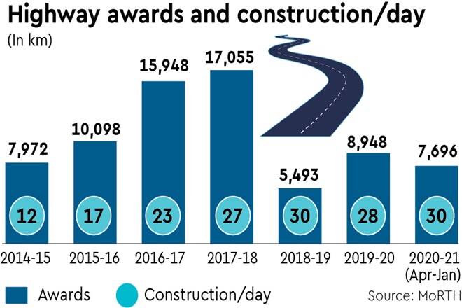Super-fast Highway construction: Highway construction on a record-breaking spree. Despite the pandemic, highway construction in April-January this fiscal rose to 30 km/day, from 28 km/day in 2019-20. In the past, it was only in 2018-19 that the pace of building of highways touched the 30 km/day mark. The February-March period of the current fiscal is seen witnessing even speedier construction.