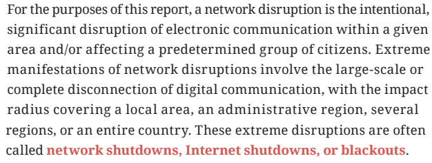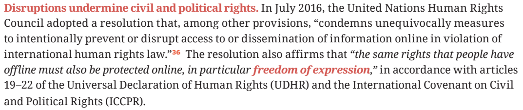 Although governments dictate blackouts, internet service providers are the ones who implement them. Companies frequently justify compliance with these requests as a matter of following local law, suggesting that they risk losing their licenses if they don’t. But providers should heed the UN Guiding Principles on Business and Human Rights, the most widely accepted set of rights standards for businesses, and reconsider their blind cooperation. After all, the UN Human Rights Council has unequivocally condemned measures to intentionally prevent or disrupt access to or dissemination of information online as a violation of international human rights law. (Source)