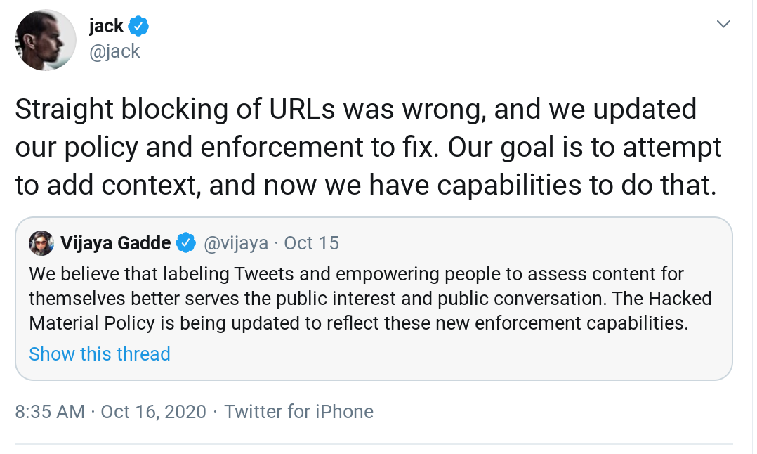 Jack Dorsey elaborated on Twitter’s role in the NY Post controversy. Was that a “self-goal?”