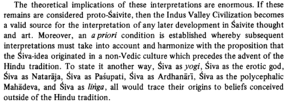 Her postulation is - Harappans had Shiva. Hindus have Shiva. But Hindus were Aryans, so Shiva was not Hindu. Says who? We historians. So you historians put forward Santa-Clausian drivel called Aryan Invasion Theory and then use it to construct every other idiocy in the name of “historical research?”