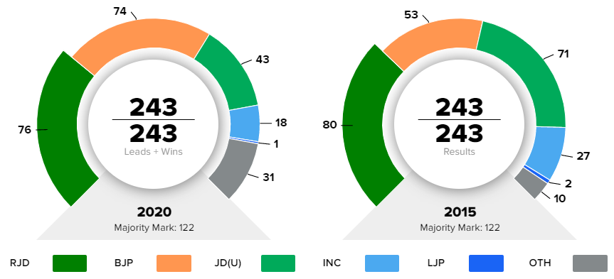The results of Bihar are coming in and the tally as of now shows a resounding win for BJP and its allies in NDA. If you see the comparative chart below, you will see that while BJP and its main ally JD (U) increased their seats in the Bihar assembly, Congress and its ally RJD lost their last time’s score.