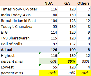 This translates into an embarrassing level of incompetence. At their best, the collection of Indian media’s pollsters missed the mark by 10%. At their worst, it was 56%.