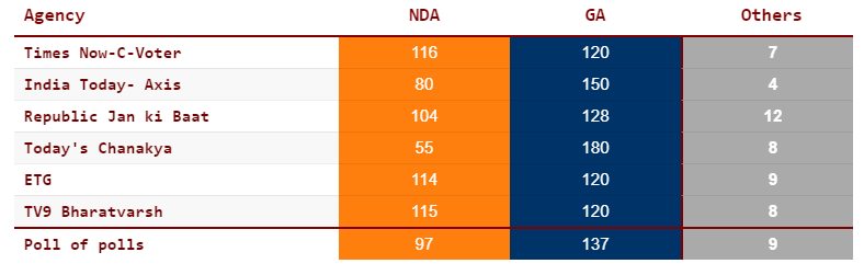 The exit polls by the Indian media showed the following scenario.