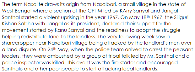“It's very difficult,” he explained, once we had settled comfortably in the bar, “to tell who are Naxalites and who aren't. You see, the tradition of terrorism has deep roots in Bengal, and today a lot of people besides Naxalites use terrorist tactics. These boys we arrested today are disaffected, and probably Communists of one shade or another, but what they are not is Naxalites. We can usually tell the Naxalites by the targets they choose, like schools and police posts, and by their techniques of attack. Bombs are their special favorite, of course. The manufacture of bombs is a cottage industry for them. They're dangerous, the bombs, because, of course, they're unexpected. The Naxalites come out of nowhere and throw them. You don't see them till they explode.” (Source)