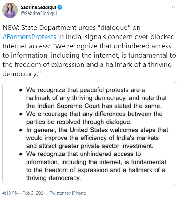 They have urged a “dialog” when the Indian government has had several rounds of dialogues already. What happened in Delhi on January 26th was an insurrection. Far worse than what happened at the Capitol. However, there is no mention of that.