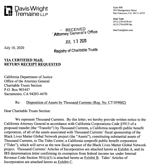 However, earlier this year - July 2020, Thousand Currents handed off the “assets related to Black Lives Matter” to Tides Center. (Source)