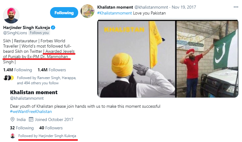 Here is another businessman - Harjinder Singh Kukreja, who was awarded the “Jewels of Punjab” award by Dr. Manmohan Singh. On social media, he follows groups which are beholden to and swear by Pakistan, while calling for Khalistan.