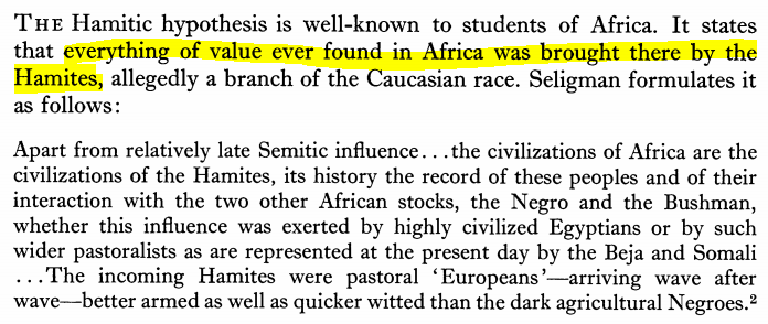 The Hamitic Hypothesis was a 19th-century anthropological theory that claimed that humans originated in Asia and then migrated to other regions of the world. The theory was used to explain the discovery of so-called “white races” in Africa in the late 1800s. The Hamitic Hypothesis was not simply a curiosity of anthropological science. It was an idea that changed lives: from those European colonists who relied upon it to justify their presence in Africa, to the scientists who used it to explain away the accomplishments of African civilizations as a result of “white” influence. Ultimately, the Hamitic Hypothesis anchored a global theory of human origins and migration that, when combined with the Aryan race theory, shaped anthropology, colonial policy, and even the attitudes of Africans themselves for a hundred years.